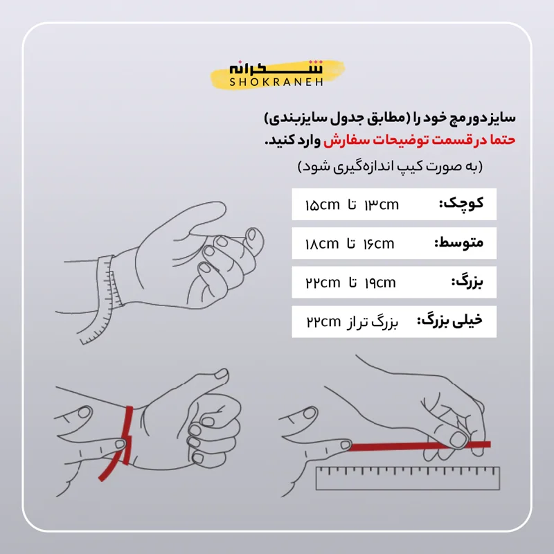 حتما دور مچ را به صورت کیپ با متر اندازه بگیرید و در قسمت توضیحات سفارش وارد کنید. / ساق دست (آستینک) برند شکرانه از جنس کرپ حریر درجه یک، بدون پرزدهی، بدون دید، بدون نخ کش شدن و بسیار با دوام میباشند. / مناسب مهمانی و استفاده روزمره می باشد. / برای اطلاعات بیشتر قسمت توضیحات تکمیلی و مشخصات را در پایین صفحه مطالعه کنید.
